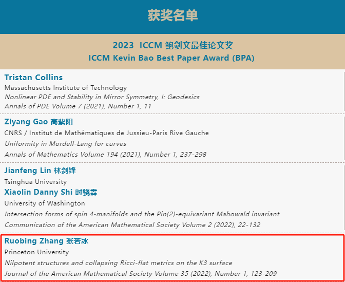 2007级校友张若冰获得2023年度世界华人数学家联盟最佳论文奖。