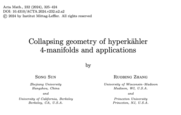 2007级校友张若冰与浙江大学数学高等研究院教授孙崧合作的题为《Collapsing geometry of hyperkähler 4-manifolds and applications》(四维超凯勒流形的坍缩几何及其应用)的研究成果在国际顶尖数学期刊《Acta Mathematica》上发表。文章对四维超凯勒的流形坍缩几何进行了研究,并证明了该领域内的两个著名猜想,为该领域的一项重大突破。