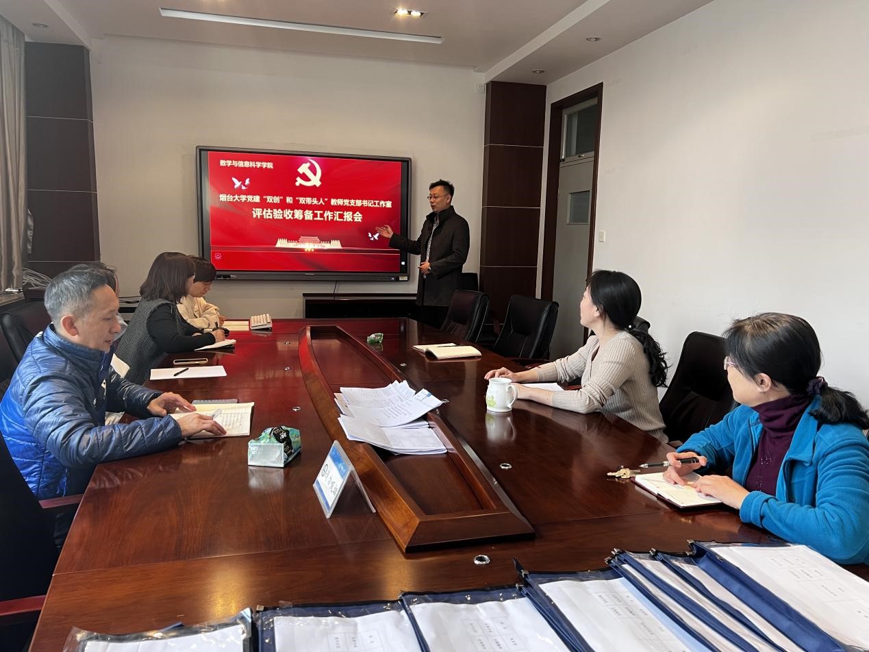 党建“双创”和“双带头人”教师党支部书记工作室评估验收工作进行专题汇报。会议由支部书记孙丰云主持,学院党总支书记张寅晗,副书记王虔祖,组织员赵立芹,数学系与基础部教工党支部书记,学生党支部书记及信息与统计教工党支部支委参加会议。