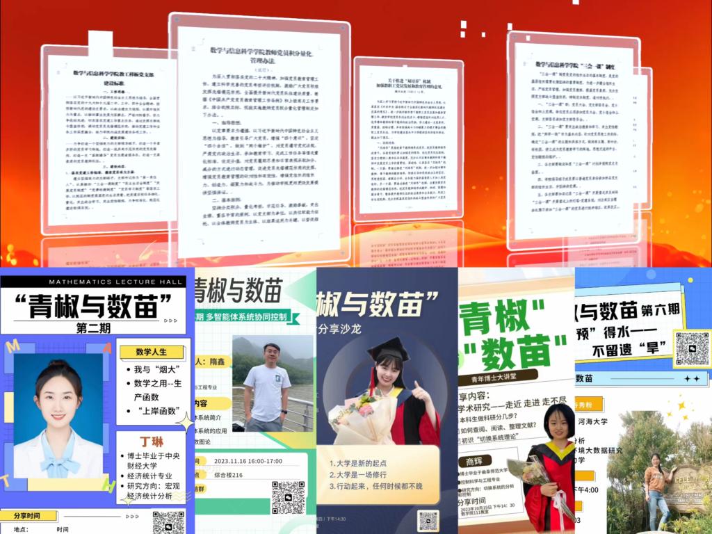 支部充分发挥党员在教学科研中的模范带头作用,打造出多支教学、科研先锋队,取得丰硕成果。两年建设期内,支部多名党员获评山东省杰青、山东省泰山学者青年专家、山东省优秀研究生导师、山东省教学名师。支部党员主讲的课程《数学建模》获山东省普通本科教育课程思政示范课程及国家级一流本科课程,支部党员主持的“建模融合、创新驱动:新工科视域下大学数学的教学改革与实践”获山东省第九届高等教育教学成果奖一等奖,支部党员作为组织负责人和骨干成员的“数学建模教学团队”获批山东省示范性基层教学组织,支部党员作为组织负责人和骨干成员的“计算数学导学团队”获评山东省优秀研究生导学团队。支部党员牵头建立禁漫屋