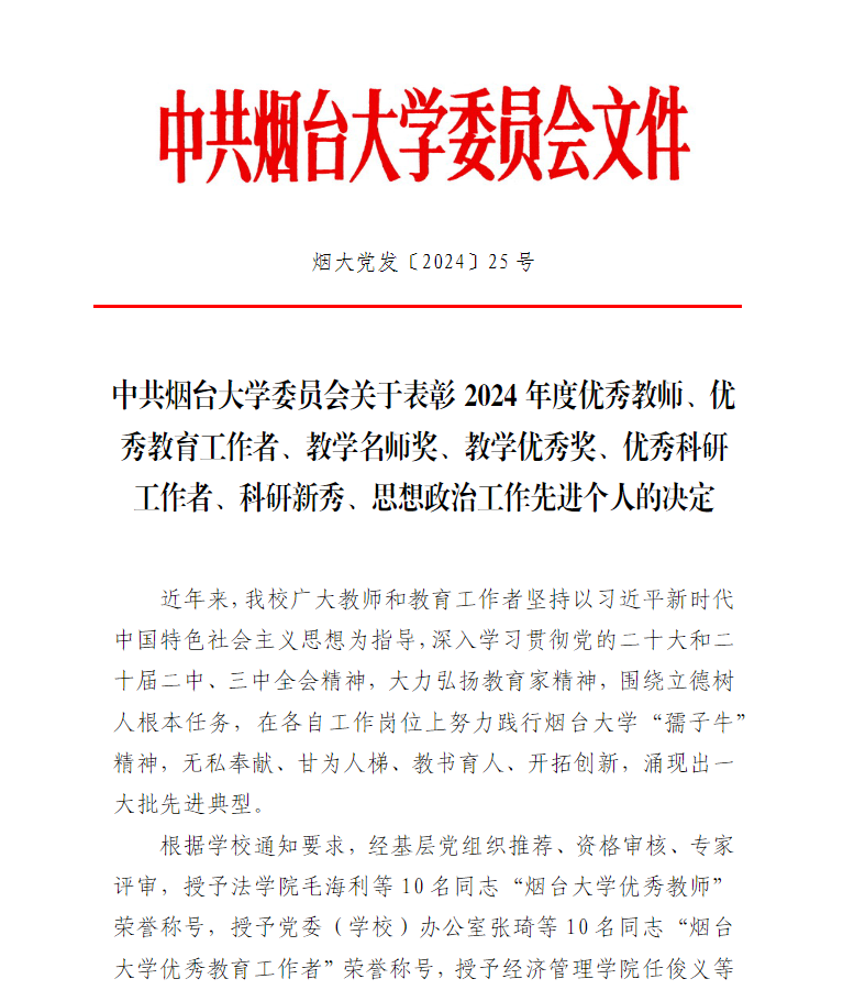 团委副书记。坚守教育初心、潜心立德树人,不断优化创新思想政治教育方式方法,积极指导学生投身志愿服务、社会实践及科技创新活动,所担任导师班级多次获评省先进班集体。曾获山东省高校主题党日活动优秀案例、山东省高校优秀党课作品,获评山东省“三下乡”社会实践优秀指导教师等。