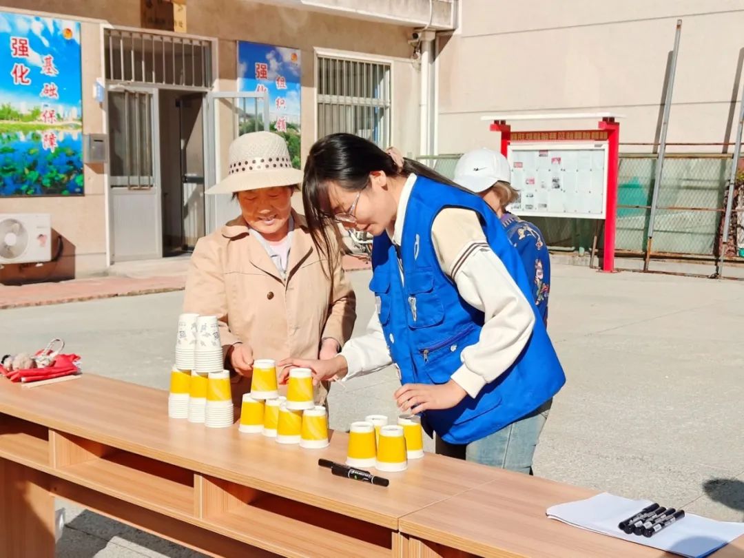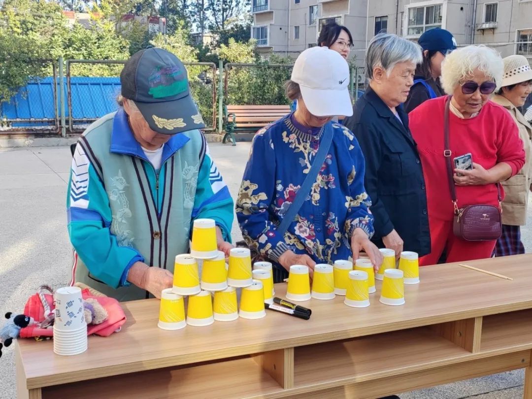 蒙眼画脸游戏,老人们充分发挥创意进行绘画,展示了他们乐观、积极的生活态度;筷子叠纸杯游戏,考验了老人们的协调性和耐心,他们用筷子将纸杯一个个叠加起来,看似简单,实则需要细心和较强的平衡感。老人们聚精会神,一次次的尝试,直到成功,成就感油然而生。