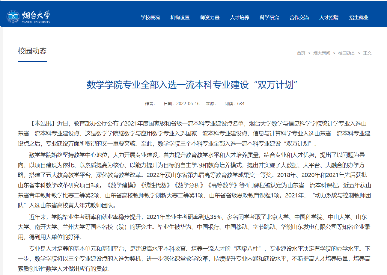 将以三个专业建设点的入选为契机,进一步深化课堂教学改革,持续提升专业内涵和建设水平,不断提高人才培养质量,培养高素质创新性数学人才做出应有的贡献。