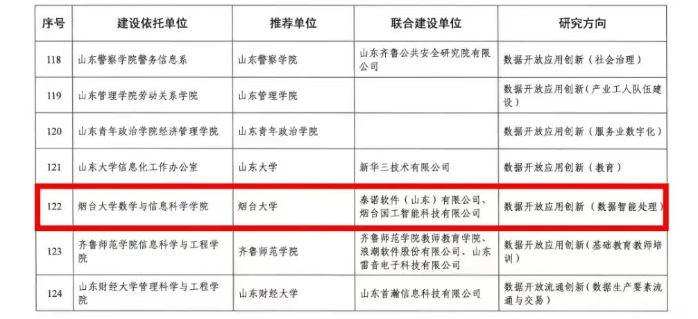 联合泰诺软件(山东)有限公司、烟台国工智能科技有限公司以“数据开放应用创新(数据智能处理)”为研究方向报送并成功入选,实验室负责人为我支部党员陈传军。