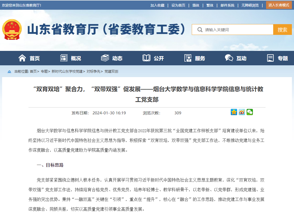 2024年1月30日,在山东省教育厅“新时代山东学校党建专题”发表党建双创典型案例《双育双培”聚合力,“双带双强”促发展——禁漫屋 信息与统计教工党支部》。